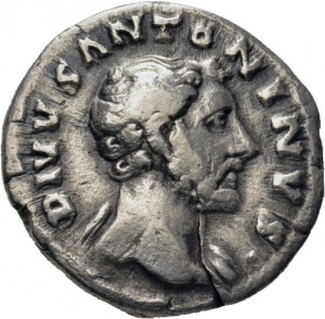 Obverse: DIVVS ANTONINVS. Kopf des Antoninus Pius nach r., drapiert über die l. Schulter.