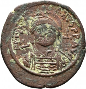 Vorderseite: D N IV[STINI]-ANVS P P AVC. Büste des Justinianus I. mit Helm frontal, r. Globus mit Kreuz; im Feld r. Kreuz.