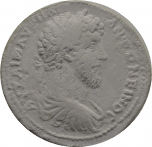 Vorderseite: ΑΥ ΚΑΙ Μ ΑΥΡΗΛΙ - ΑΝΤΩΝΕΙΝΟΣ [Σ als C; Υ als V; rundes E]. Büste des Mark Aurel mit Lorbeerkranz nach r.